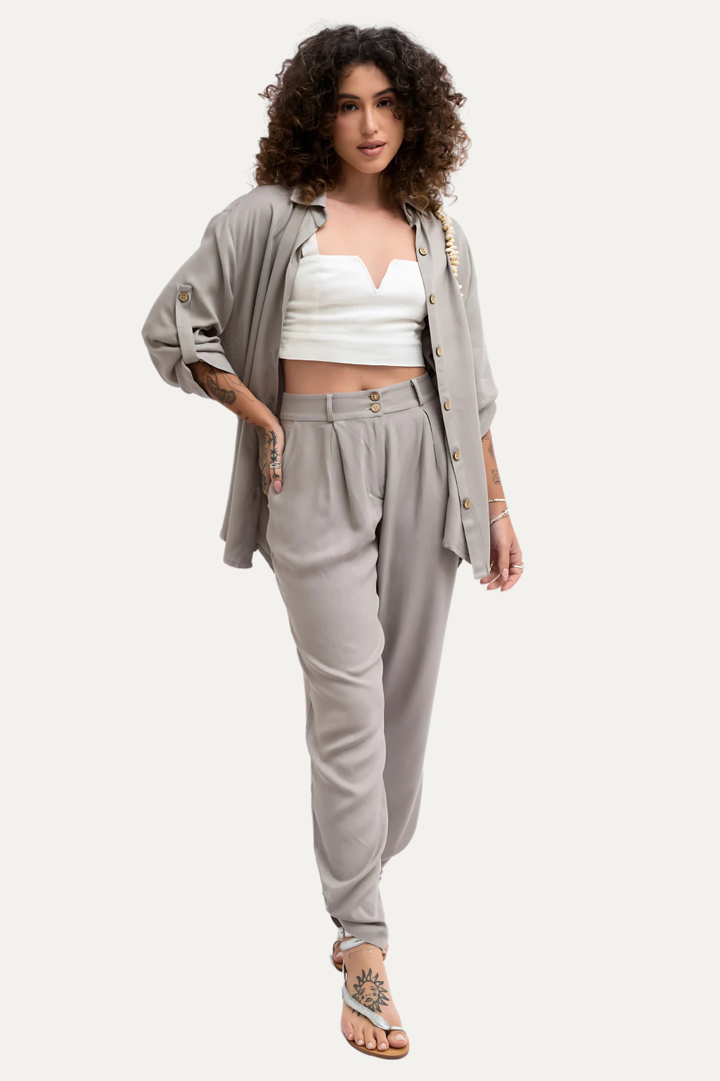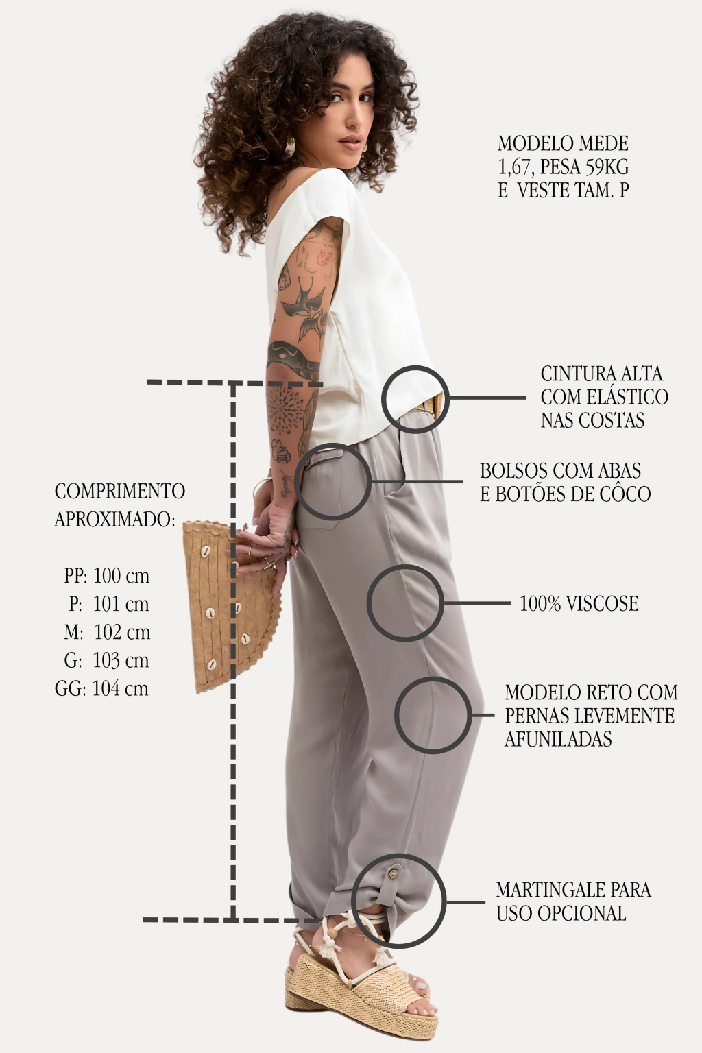 A Calça Bainema tem modelagem reta levemente afunilada na perna, trazendo um charme descontraído e moderno. Possui cintura alta com cós anatômico, que valoriza a silhueta com conforto e o elástico nas costas se ajusta ao corpo sem apertar. Os bolsos traseiros com abas e botões trazem um charme utilitário e o martingale na barra é um detalhe que permite variar o estilo, deixando a peça ainda mais versátil. Um modelo que une praticidade e sofisticação no dia a dia.