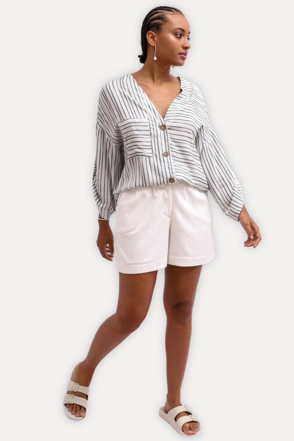 O Short Roma é aquele clássico indispensável no guarda-roupa! Feito em linho com viscose, ele une sofisticação e conforto em uma modelagem de cintura alta com caimento impecável. Seu comprimento medido garante equilíbrio entre elegância e praticidade. O botão forrado no mesmo tecido e os passantes largos deixam a peça ainda mais sofisticada. Perfeito para looks casuais ou mais arrumados, sem esforço!