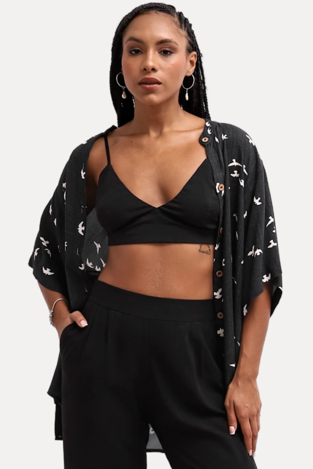 O Top Ava é um top tipo biquíni com base larga, alças reguláveis e elástico nas costas para um ajuste ideal. Sua modelagem oferece sustentação nas laterais do busto, garantindo um decote elegante e definido. Ideal para usar sob peças amplas como kimonos e camisões, ou como substituto do sutiã em roupas mais decotadas. Adicione esse top versátil ao seu guarda-roupa e eleve seu estilo com conforto!