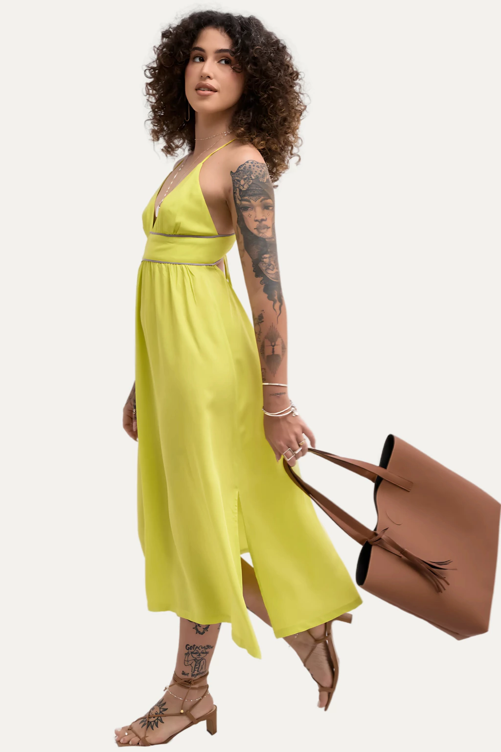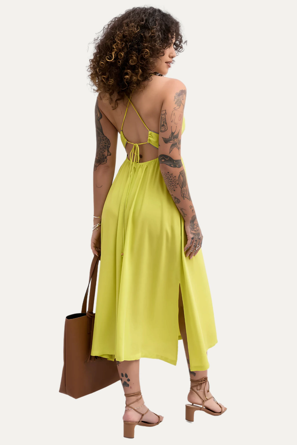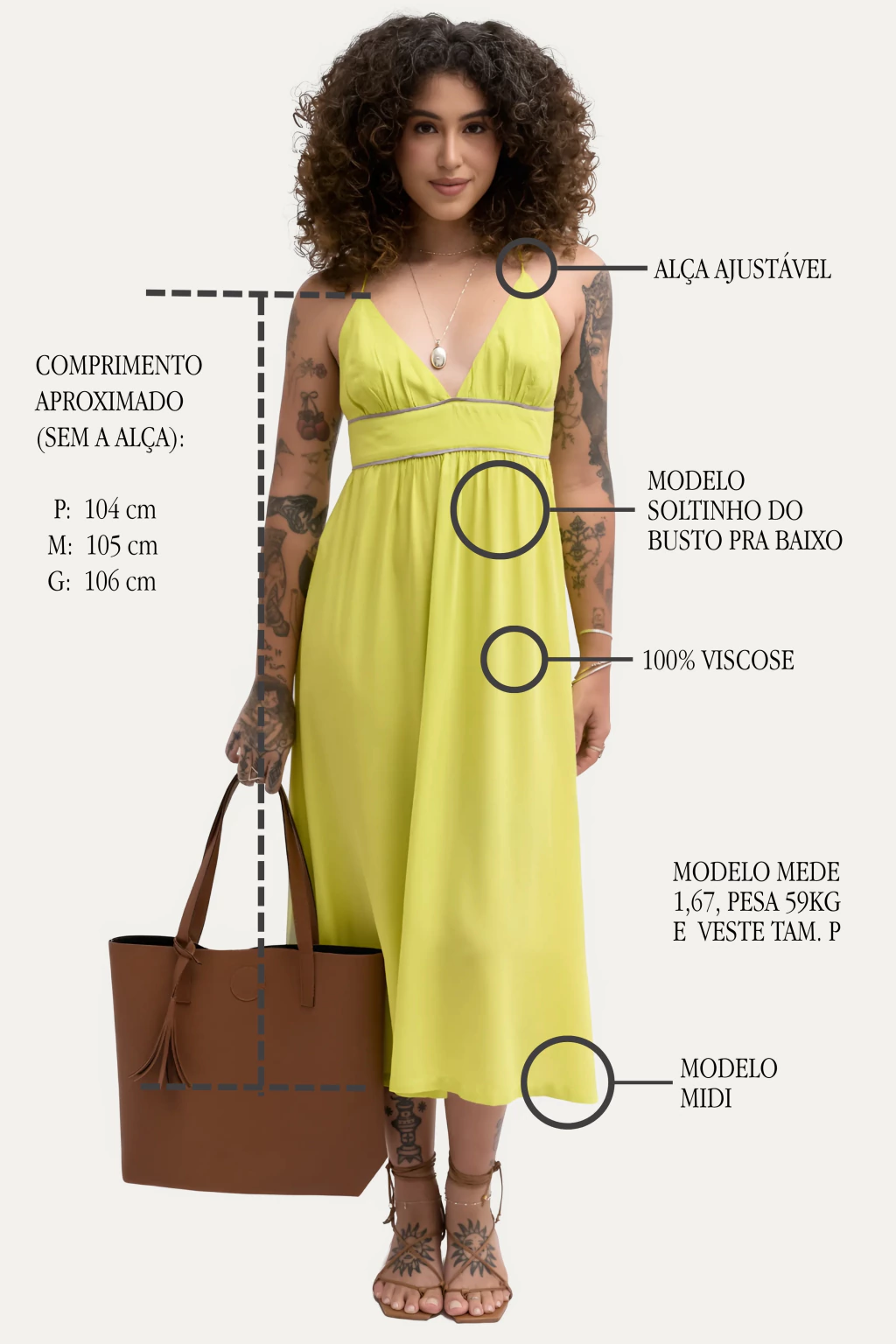 O Vestido Subaúma tem decote em V que valoriza o busto e base ajustável com amarração nas costas, oferecendo sustentação e conforto. A saia fluida garante leveza ao vestir e o comprimento midi traz um toque moderno à peça. As costas nuas finalizam o modelo com charme e sensualidade na medida certa.